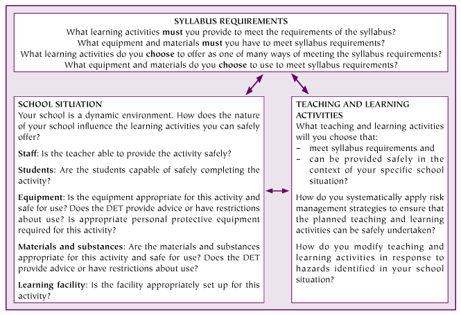 Changes in the school situation to any one of the factors identified in the diagram may influence safety. It is essential that the procedures that are implemented in the school provide the technology teacher with a range of strategies to identify and respond effectively to changes in the school situation.